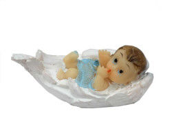 Mavi renkli kanat içinde bebek ürünümüz, 5cm x 2cm boyutlarındadır ve polyester malzemeden üretilmiştir.