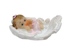 Pembe renkli kanat içinde bebek ürünümüz, 5cm x 2cm boyutlarındadır ve polyester malzemeden üretilmiştir.