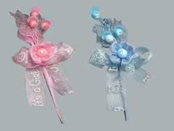 Pembe renkli süslenmiş hazır ürün çiçek, 6cm x 12cm boyutlarındadır ve plastik malzemeden üretilmiştir.