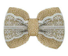 Çuvaldan yapılmış dantelli fiyonk ürünümüz, beyaz renklidir ve 8.5cm x 6cm boyutundadır.